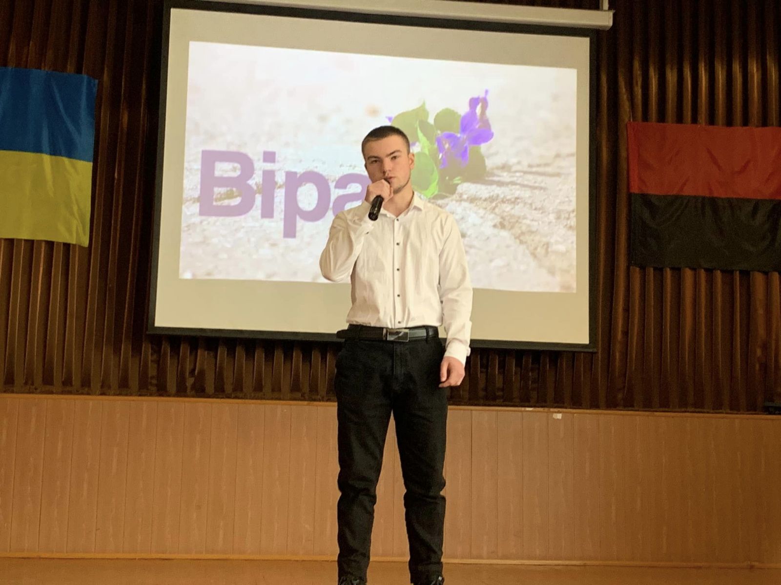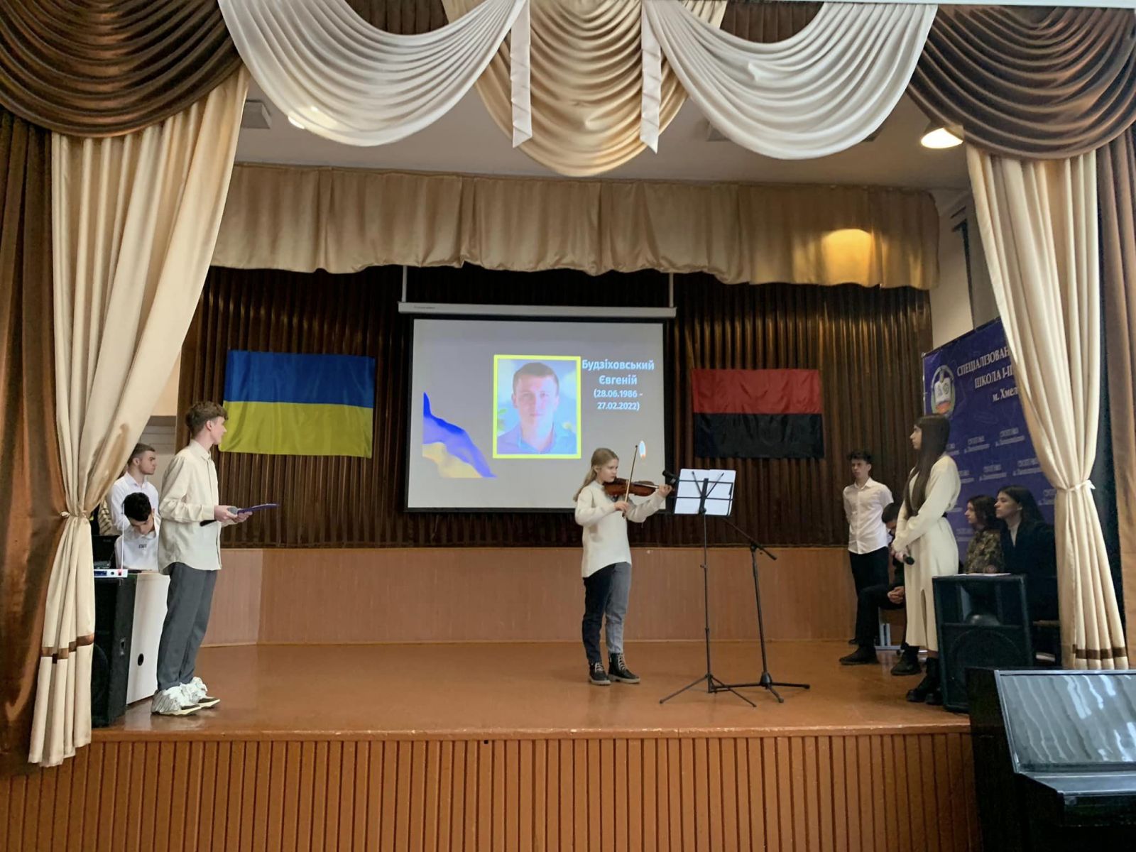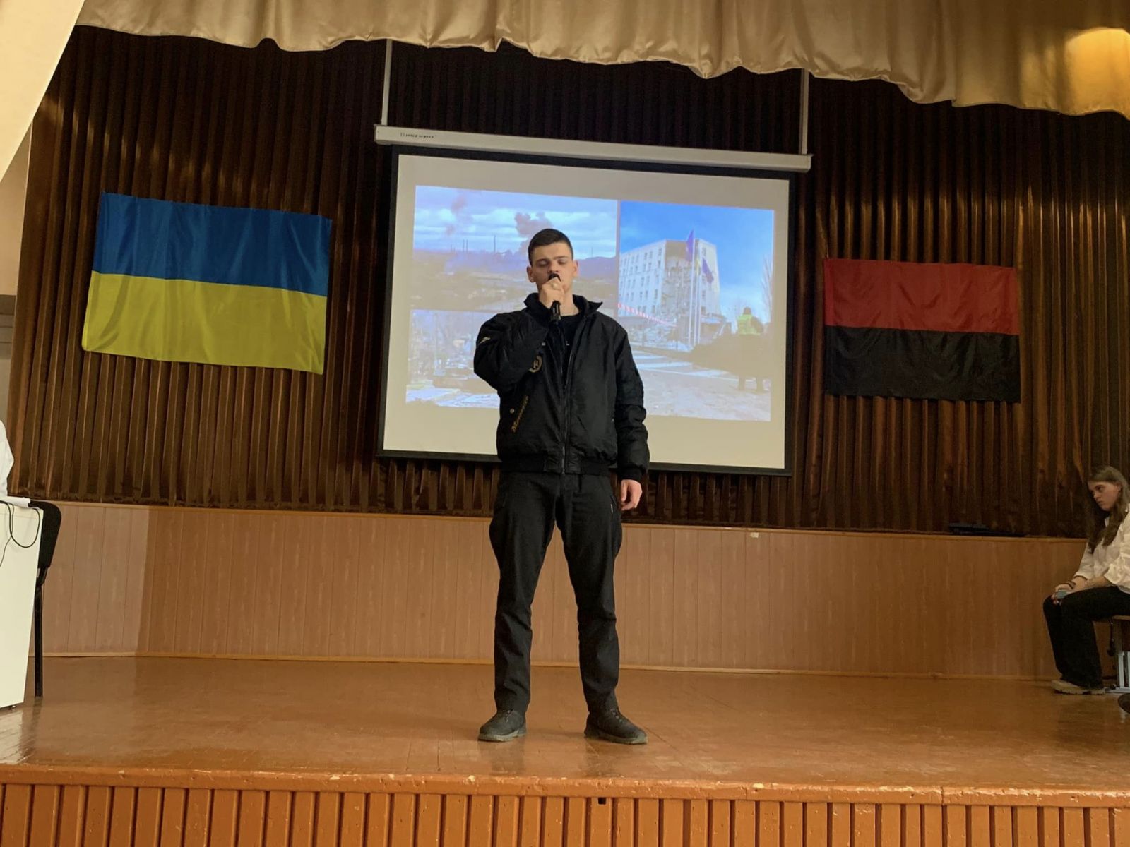 Почесний гість капітан ЗСУ Олексій Володимирович Наконечний розповів учням про свого товариша, однокурсника, випускника нашої школи Прохніцького Олександра, який загинув.