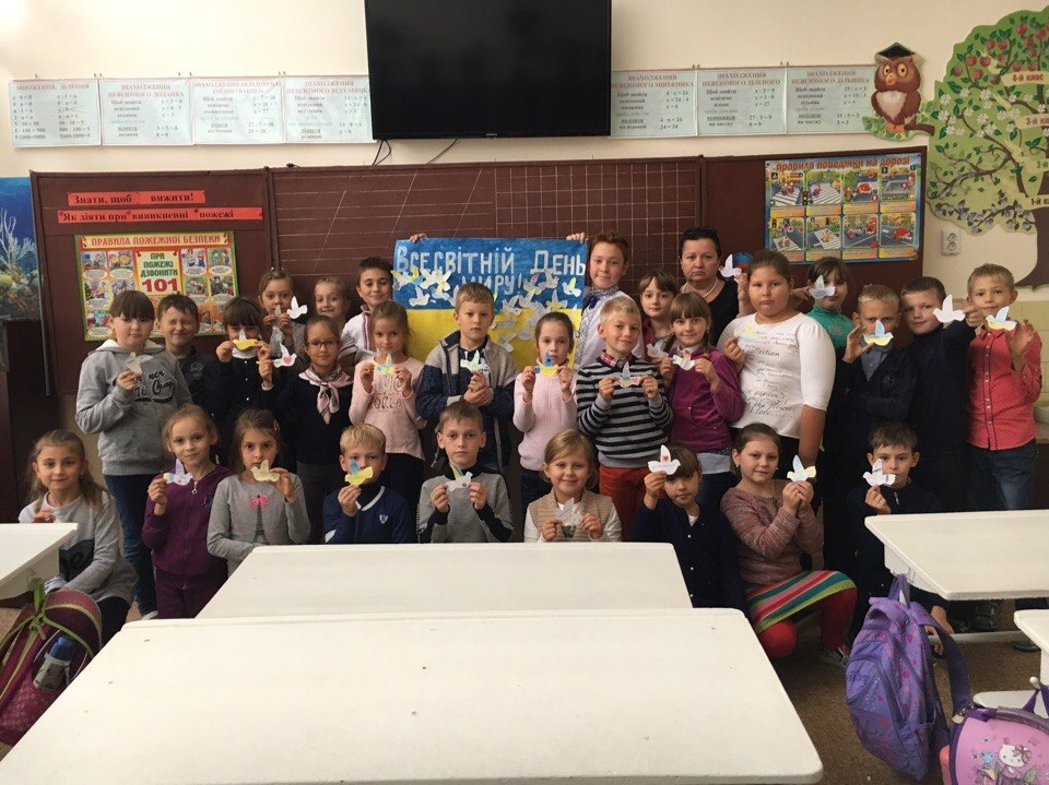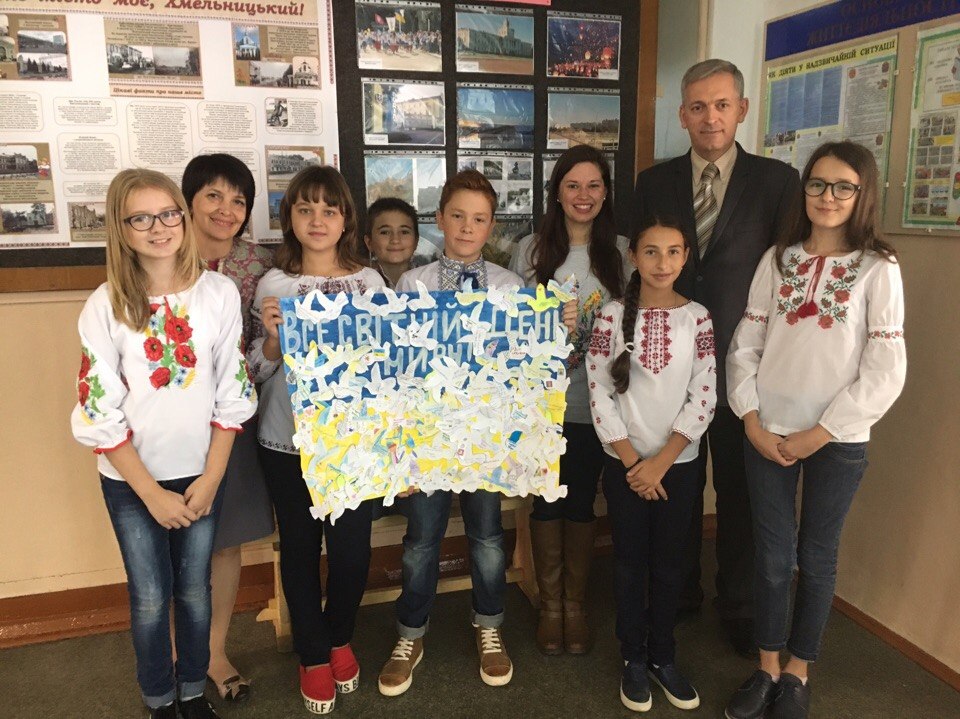 Міжнародний день миру (англ. International Day of Peace), який був заснований в 1981 році Організацією Об'єднаних Націй як щорічне свято відмови від насильства і припинення вогню в глобальному масштабі. Щороку 21 вересня люди в різних куточках земної кулі так чи інакше віддають данину миру. Це свято покликане змусити людей не тільки задуматися, але й зробити що-небудь заради миру. Учні 7-Б класу за ініціативою Хмельницької ради лідерів "Нова Генерація міста" привітали всіх учнів, батьків, учителів школи з Міжнародним днем миру. Почесним гостем цього дня стала волонтер Корпусу Миру з США Ешлі Олет. Листівки "Найкращий подарунок-мир!", різними мовами, змусили замислитися над вічними цінностями учнів школи. Нехай МИР завжди панує в Україні ! Бережімо нашу святу землю! А плакат з побажаннями від земляків поїде до наших воїнів на схід України, які воюють за нашу землю.